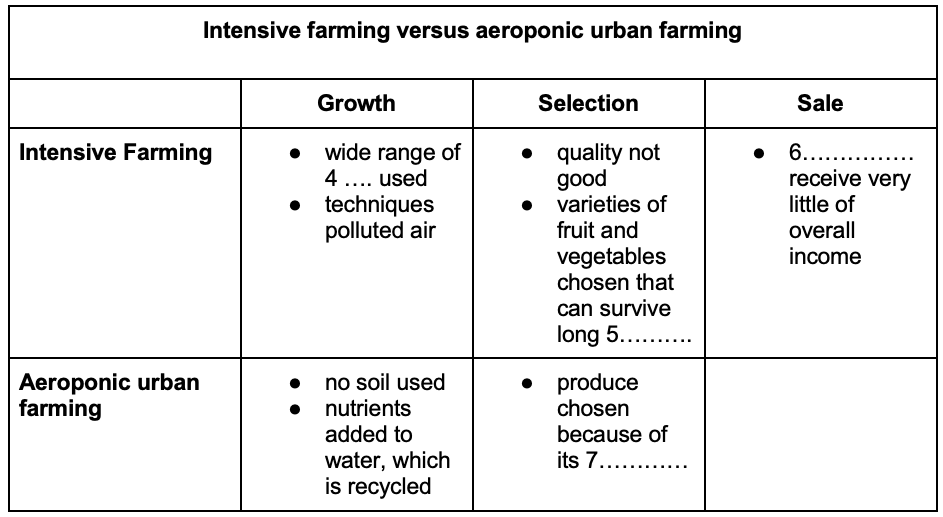 Giải thích: đoạn so sánh giữa Intensive farming và Aeroponic farming là đoạn 4, trong đó có thông tin là “most of the fruit and vegetables we eat have been treated with something like 17 different pesticides, or that the intensive farming techniques that produced them …”, tức là phương pháp Intensive farming sử dụng tới 17 loại thuốc trừ sâu.
